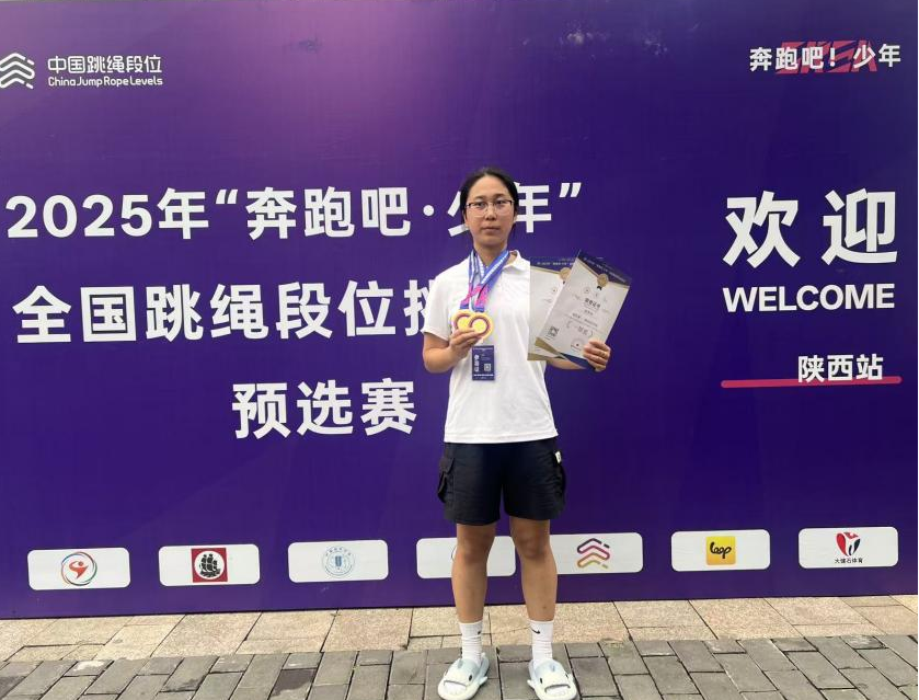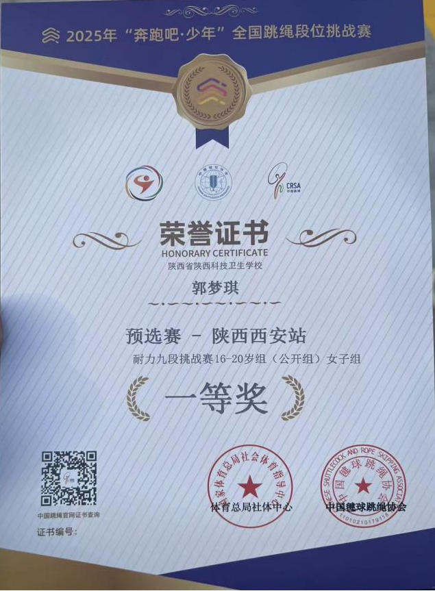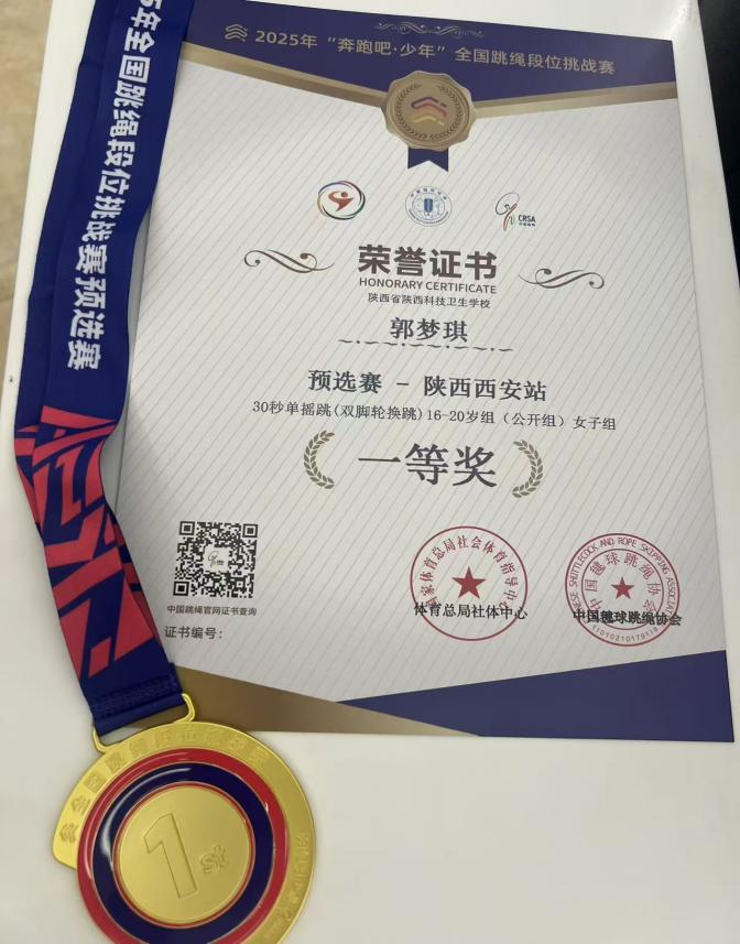 2025年“奔跑吧·少年”全国跳绳段位挑战赛陕西站10月8日落下帷幕,由体育老师孙德乾带领的我校学生郭梦琪获得16到20岁组别女子组30秒单摇跳(双脚轮换跳)第一名,耐力九段挑战赛第一名。